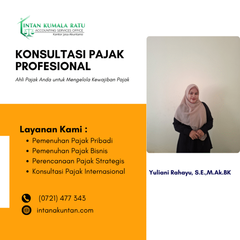 Kantor Jasa Akuntansi Intan Kumala Ratu adalah sebuah entitas profesional yang bergerak di bidang penyediaan jasa akuntansi dan konsultasi keuangan. Didirikan untuk membantu individu, UMKM, dan korporasi dalam mengelola aspek keuangan dan pelaporan mereka secara efektif, KJA ini berkomitmen untuk memberikan layanan yang akurat, terpercaya, dan sesuai dengan peraturan yang berlaku dan berdedikasi untuk menyediakan berbagai layanan terkait kepatuhan pajak. Perusahaan ini berkomitmen untuk memberikan layanan berkualitas tinggi, didukung oleh tim profesional terampil di bidang akuntansi dan perpajakan, yang bertujuan untuk memastikan kepuasan dan kepercayaan klien.